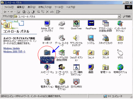 1.デスクトップ上の『マイコンピュータ』→『コントロールパネル』内、『ネットワークとダイヤルアップ接続』